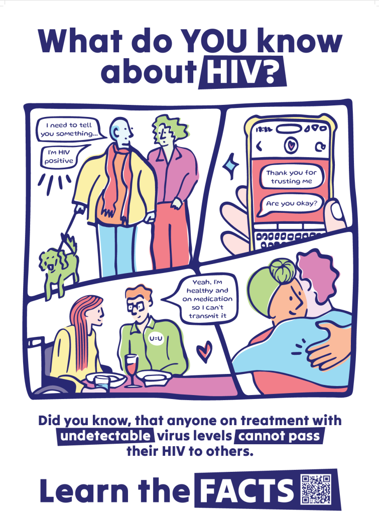 In June 2025, Helios particiated in the We Design for the Community project. We were matched with talented graduate designer, Beth Trim to work on a poster for a street location and decided to work on raising awareness of HIV and dispelling myths and combatting HIV stigma. A group of Helios clients met with Beth who took forward the ideas to produce a poster that was displayed on a street in Kings Cross. This poster is also available to download here if you would like to print it or circulate it.